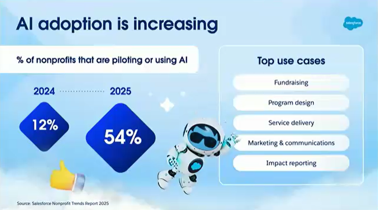 The good news? AI adoption is increasing in response. Nonprofits are turning to AI to help them solve these challenges, consequently leading to an increase in AI adoption—Salesforce found that the percentage of nonprofits piloting or using AI jumped from 12% in 2024 to 54% in 2025. The top use cases that Salesforce found nonprofits were leveraging AI for were fundraising, program design, service delivery, marketing and communications, and impact reporting.